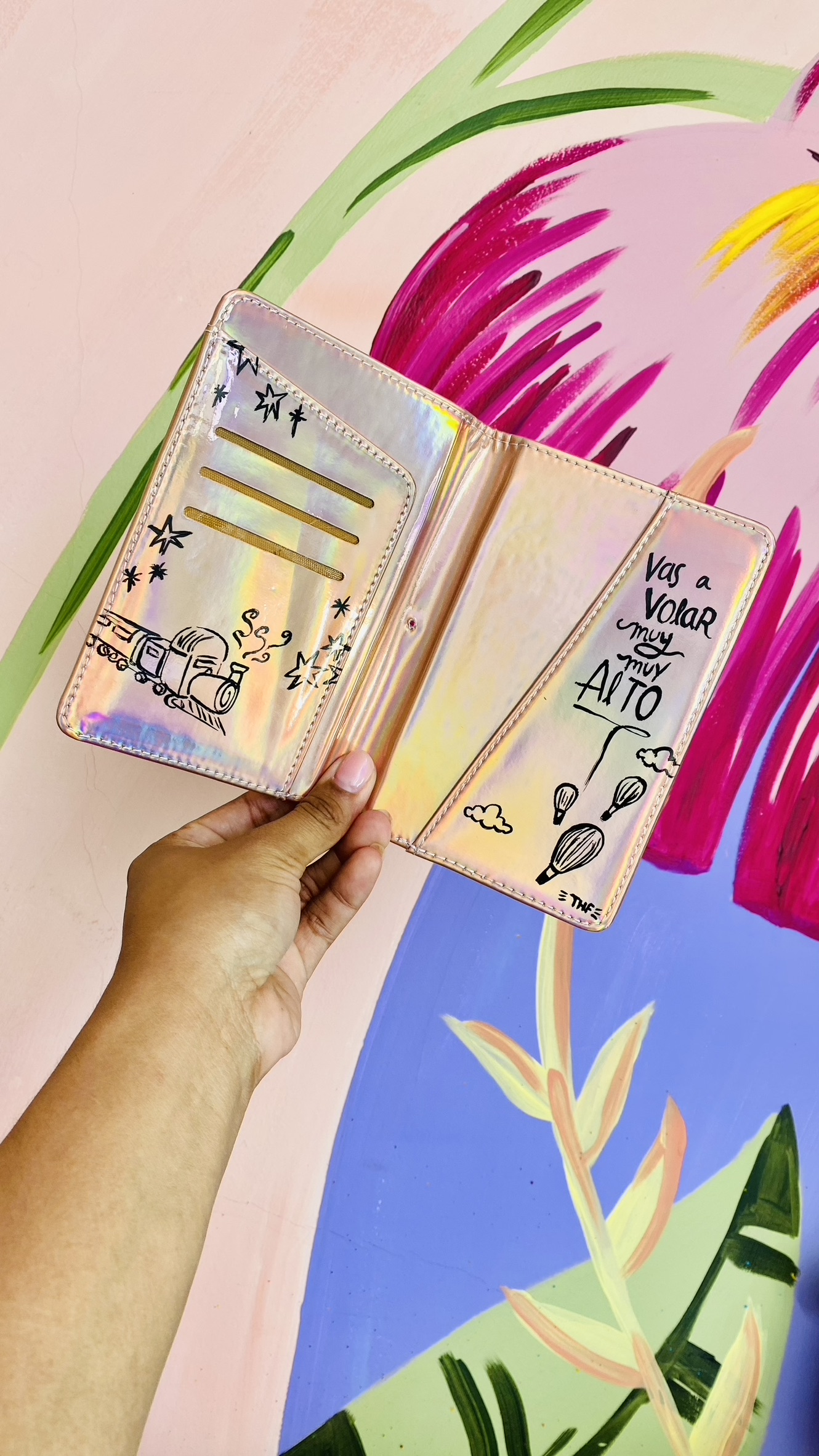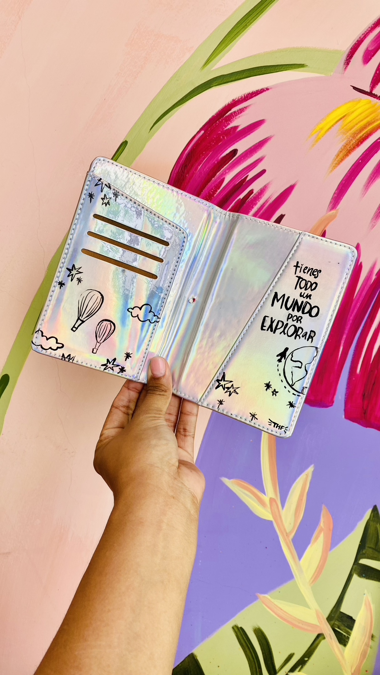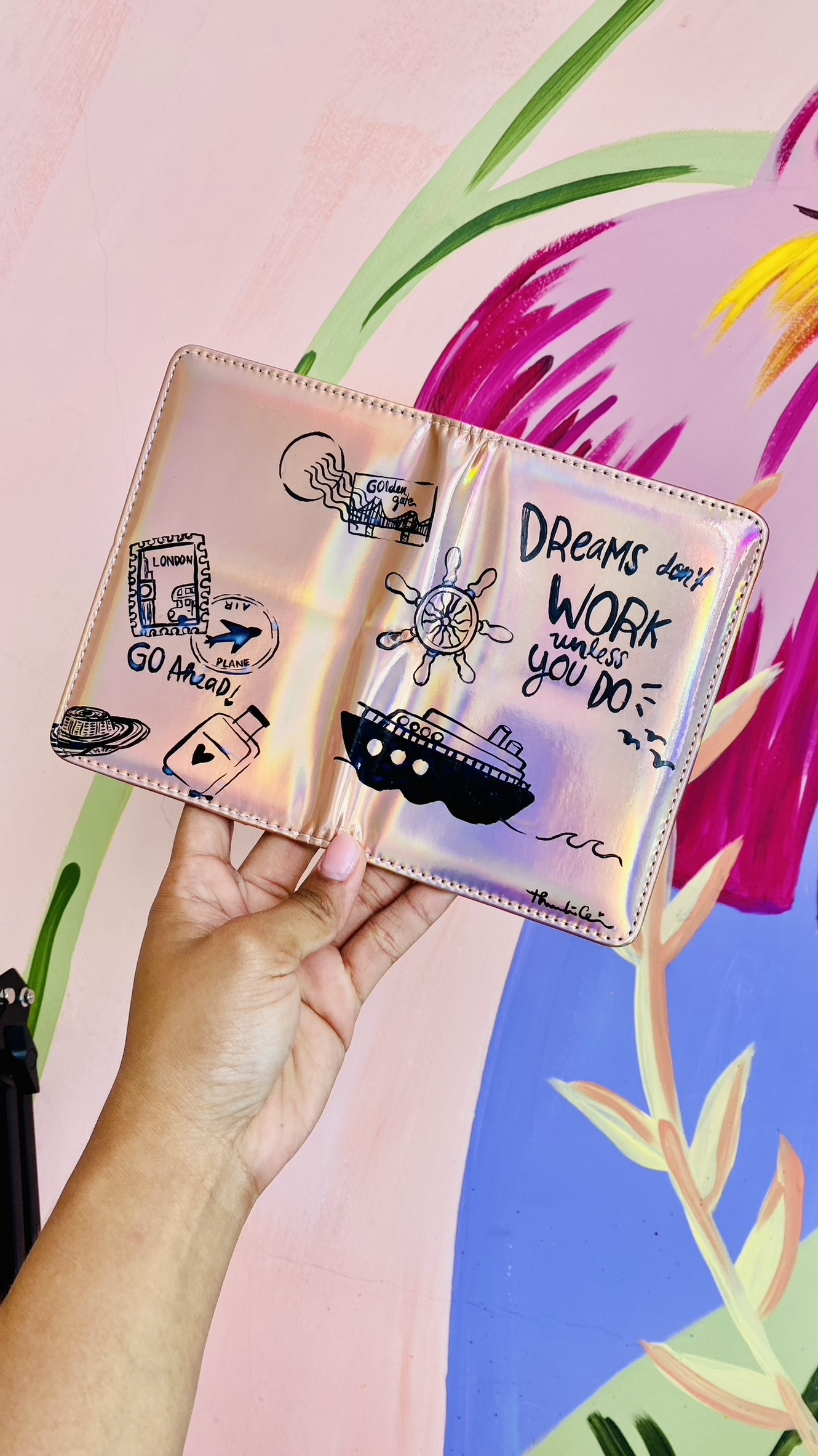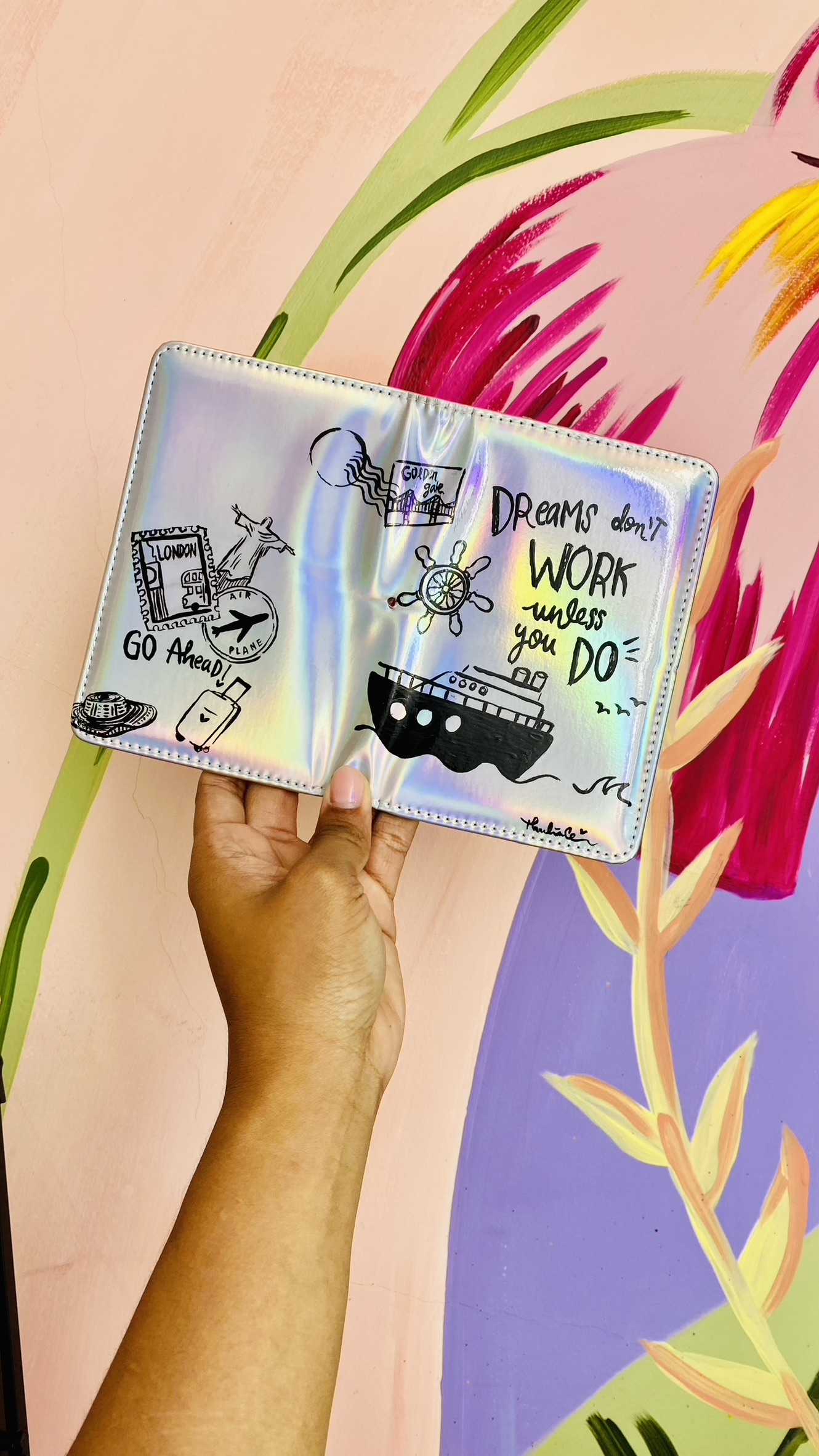Tiene compartimientos para llevar tu pasaporte, tarjetas o documentos esenciales, pero también un mensaje que acaricia el alma: “Dreams don’t work unless you do”. Cada detalle ilustrado fue creado a mano para inspirar, para que cada vez que lo abras recuerdes que el mundo te espera, y que todo comienza contigo.